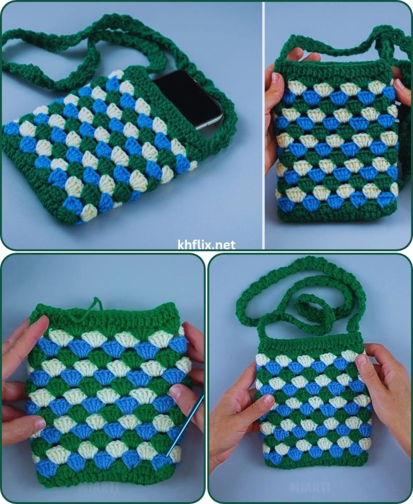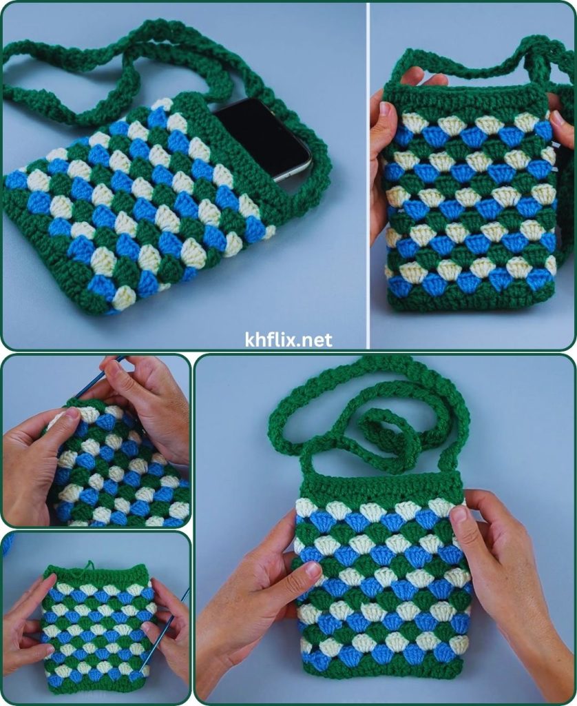- Height: You will simply continue crocheting the body of the bag until it is tall enough to cover your phone, plus about half an inch for clearance.