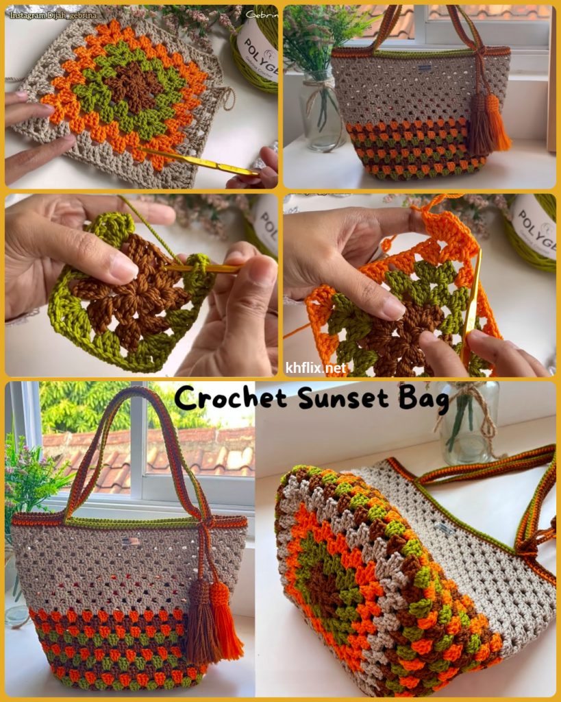 The Sunset Bag is a tote-style handbag made from granny squaresβa timeless crochet motif. When arranged and joined together, the squares create a roomy, soft yet sturdy bag with a stunning patchwork appearance.
